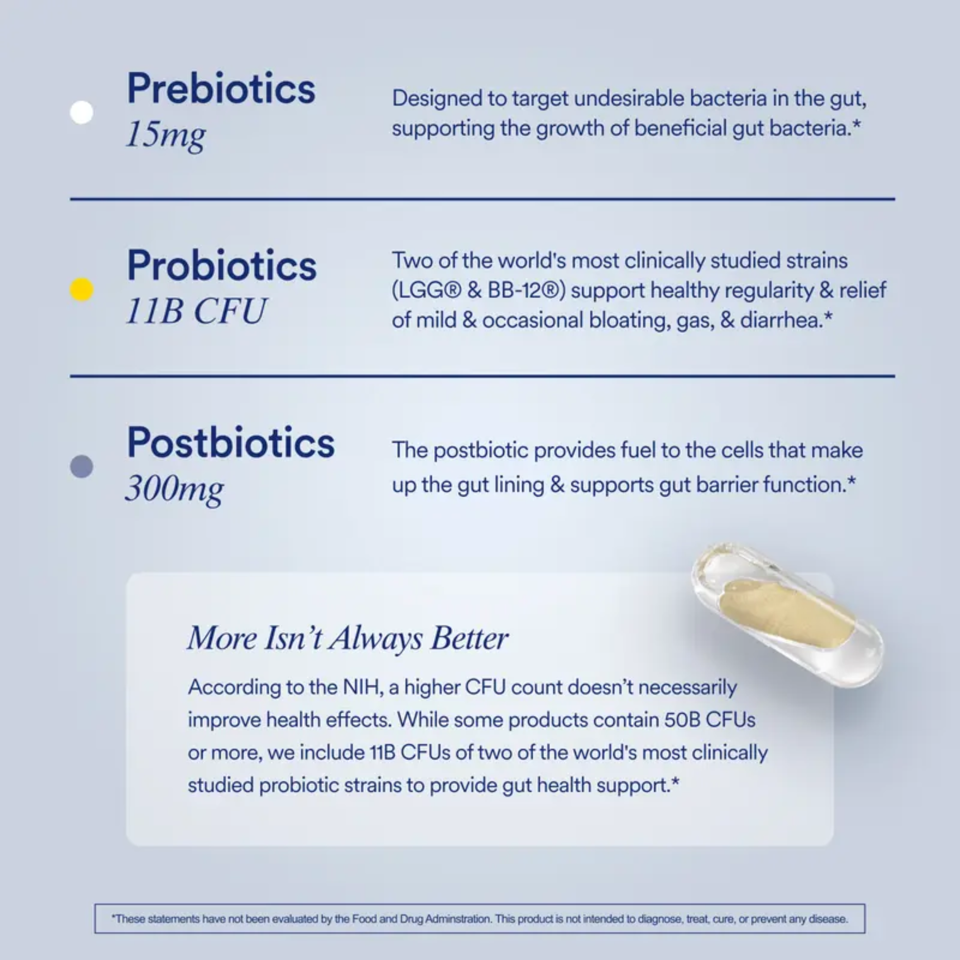 This supplement is designed to support gut balance and digestive comfort as part of a daily routine. It combines prebiotics, probiotics, and postbiotics to help maintain a healthy gut environment over time.